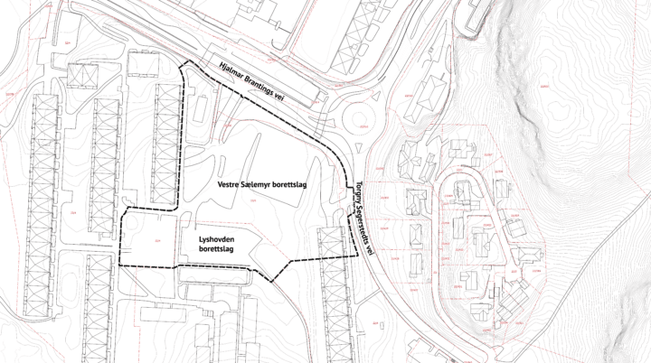 Planområdet er avgrenset som vist i kartet under, og utgjør ca. 19,8 daa. Det er tatt med arealer innenfor naboeiendom i sør (Lyshovden borettslag) for å gjøre vurderinger knyttet til sammenkobling av eksisterende og nye gangforbindelser gjennom området. Endelig planavgrensning vil avklares undervegs i planprosessen, og vil innskrenkes til det som nødvendig.